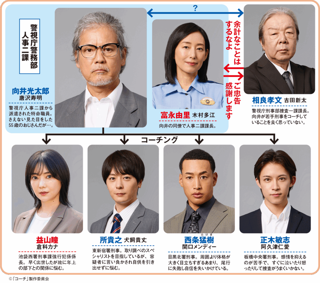 堂場瞬一の同名小説を唐沢寿明主演でドラマ化。警視庁人事二課所属の〝さえないおじさん〟向井光太郎が、捜査に失敗し行き詰まり逃げ出したくなっている若手刑事たちを“コーチ〟していく警察エンターテインメント。向井の的確なアドバイスのもと、苦境を乗り越えた若手刑事たちはやがて結集し、大きな事件に立ち向かっていくが、そこに向井の衝撃的な過去が交錯し…。本作で唐沢は、7年ぶりのテレ東連ドラ主演を務める。