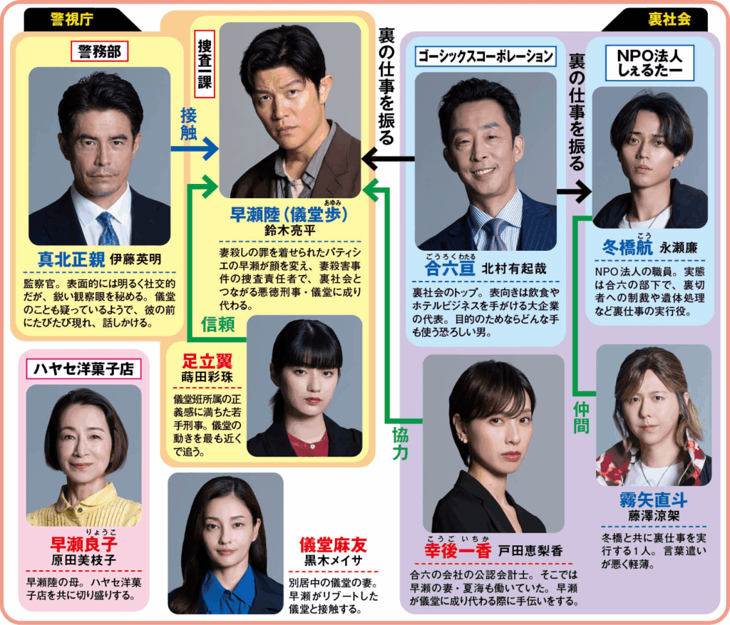 (1話)ハヤセ洋菓子店を営む早瀬は母・良子と息子・拓海(矢崎滉)と穏やかに暮らしていた。ある時、儀堂ら刑事たちが店にやって来て、2年半前に失踪した妻・夏海の白骨化した遺体が見つかったと告げられる。さらに後日、早瀬は身に覚えのない証拠で妻殺しの犯人として仕立て上げられ、逮捕されることに。だが儀堂からある取引を持ちかけられ…。